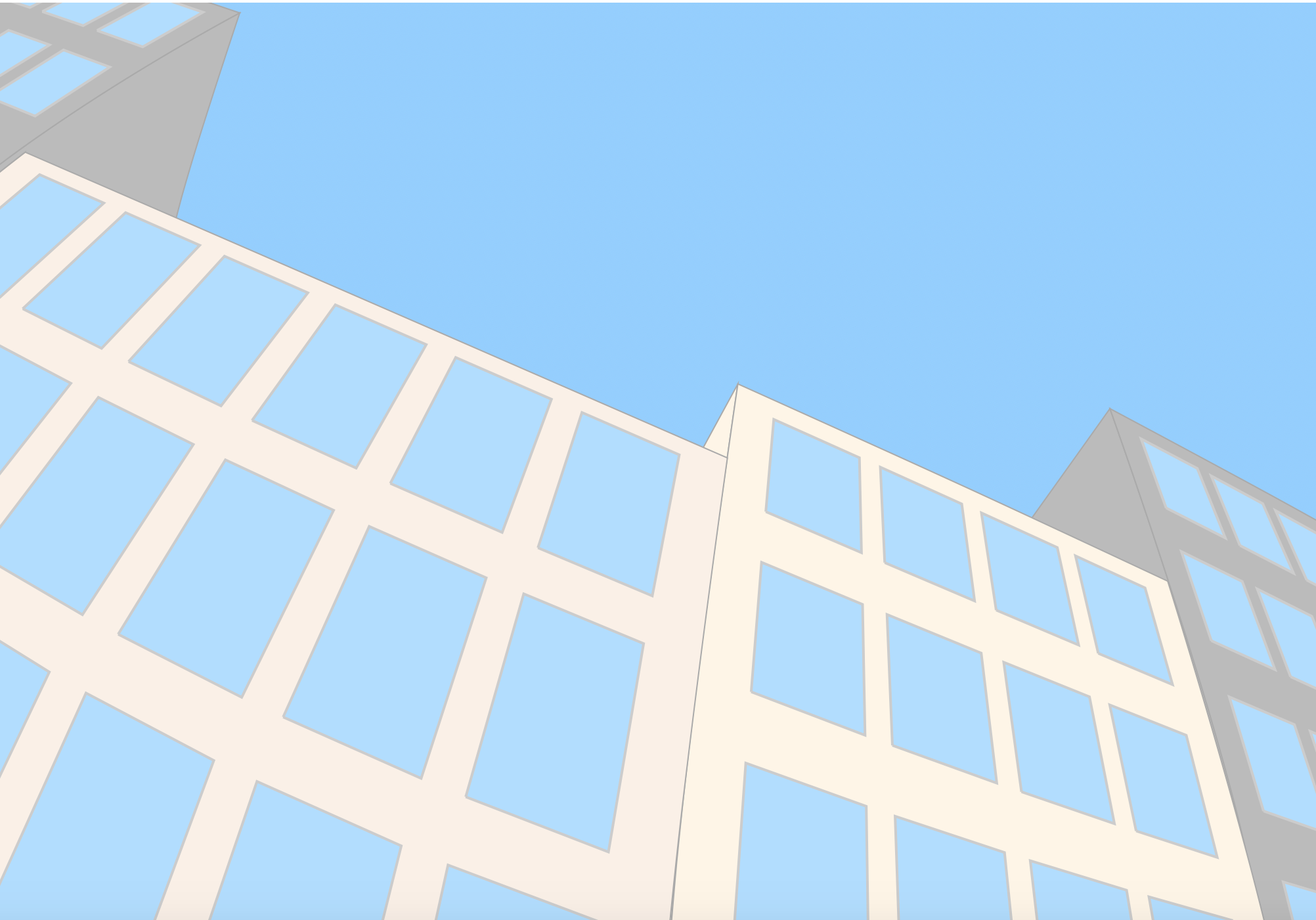 東西に並ぶ大きさと色が毎回ランダムのビルの街に入っていき、右、左、上と眺めた光景です。