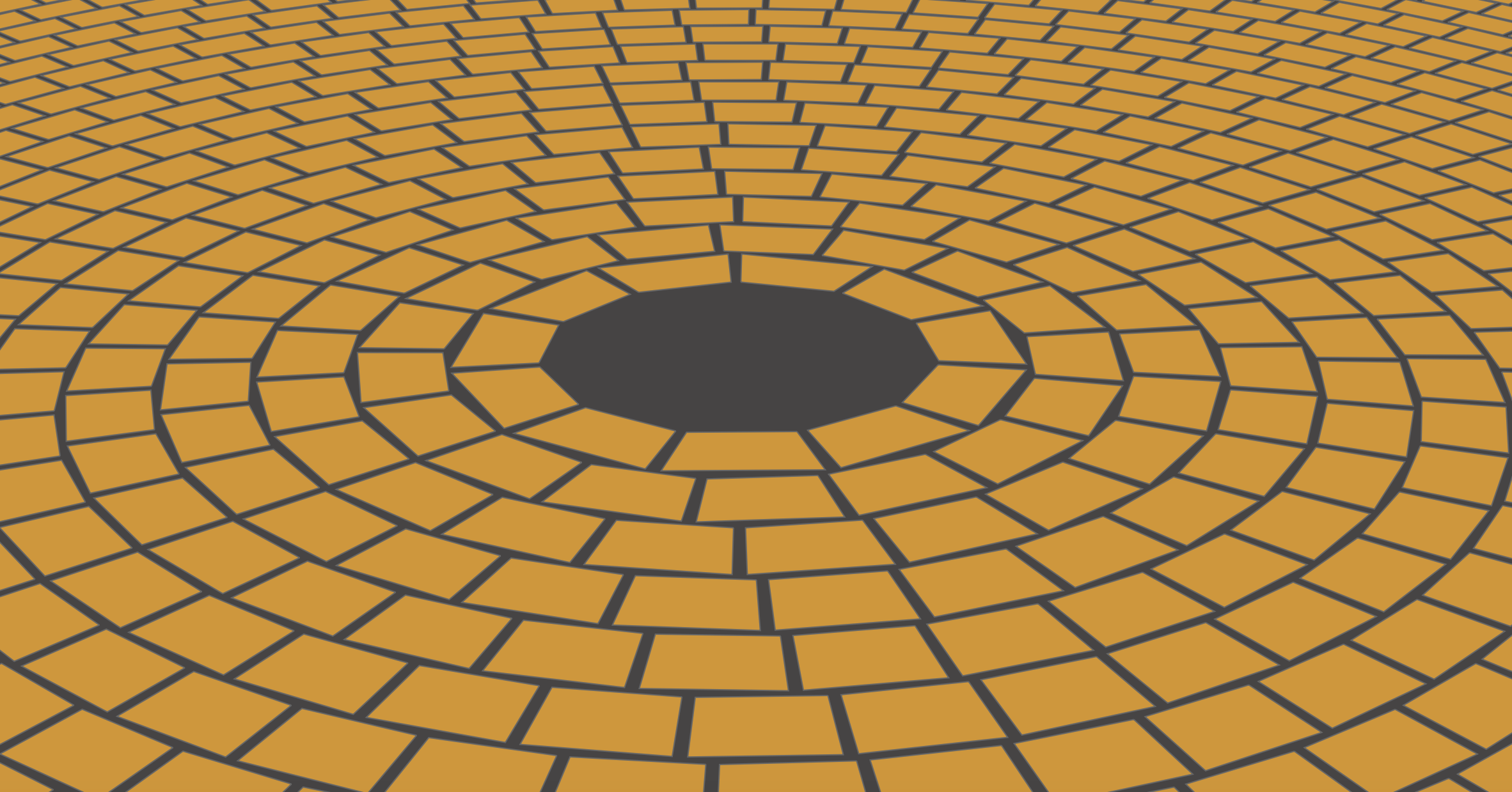 三次元空間のアニメーションを習得する目的で、地上に作った丸い石畳を上空からドローンのようなもので撮影し、至近距離に降下後、また彗星のように離れていくという画像です。