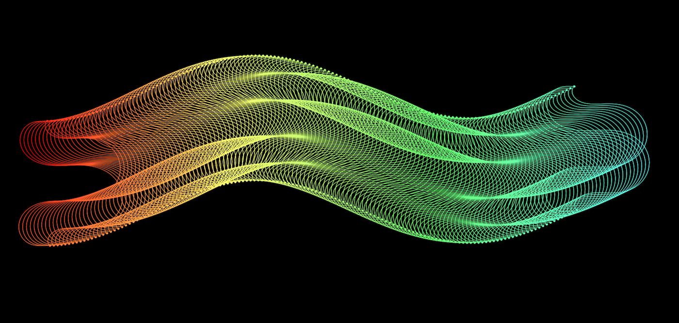 図形はベクトルの角度と長さに周期的変化を与えたもののうちラインというより幾何学的なイラストとして興味深かったものに、さらにサインカーブの周期的変化を付け加えてみました。